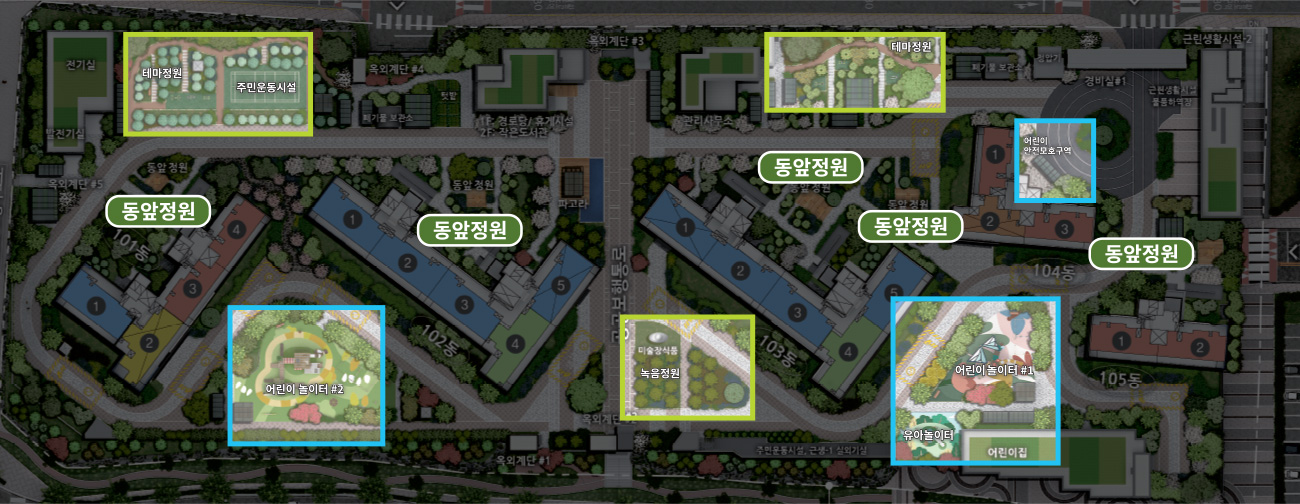 단지 곳곳의 정원과 녹음을 즐기며 거닐기 좋은 단지